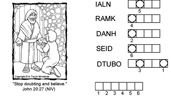 | 4. The opposite of to believe. John 20:27 (NIV) |