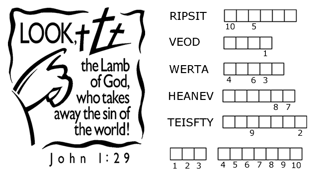 1. "I saw the _____ come down from heaven." John 1:32 (NIV) 2. A white or grey bird, often used as a symbol of peace. John 1:32 (NIV) 3. A clear liquid used to baptize. John 1:33 (NIV) 4. The place where God is. John 1:32 (NIV) 5. To tell about something you have seen. John 1:34 (NIV) |