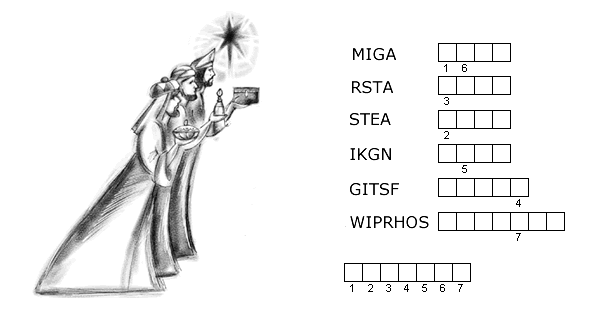 1. Another word for the wise men. 2. A twinkling point of light in the night sky. 3. The direction that is opposite of west. 4. The male ruler of a country. Herod, for example. 5. What the wise men brought to the Christ child. 6. Why the wise men wanted to find the new-born king. |